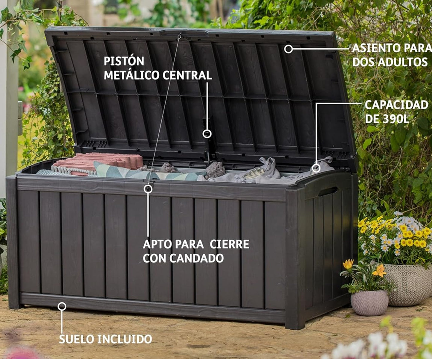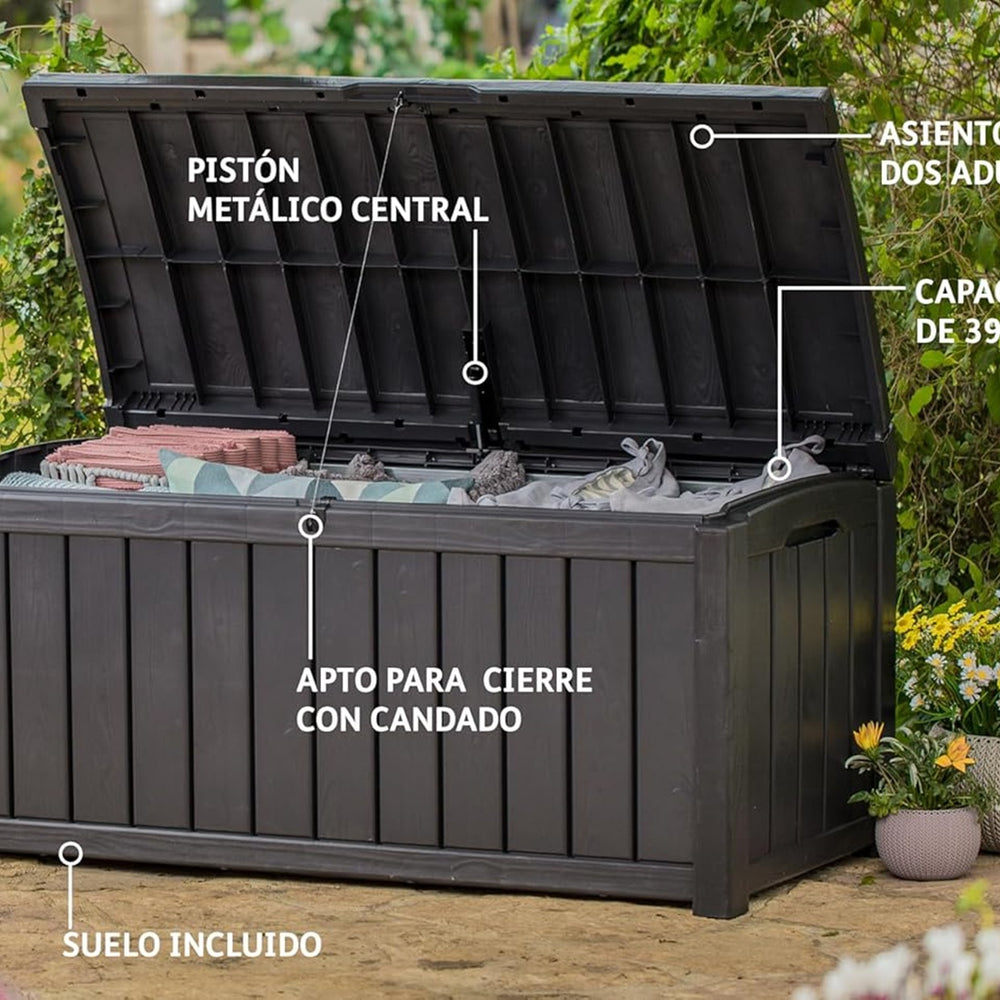 Con una capacidad generosa, este baúl es ideal para guardar almohadones, herramientas, juguetes de jardín o accesorios de exterior, manteniéndolos siempre secos y ventilados gracias a su estructura impermeable y sistema de cierre seguro. Su tapa con apertura asistida facilita el acceso al contenido sin esfuerzo.