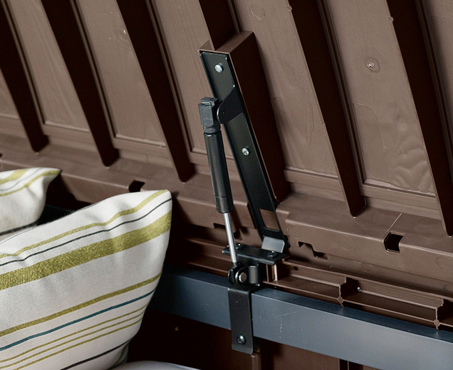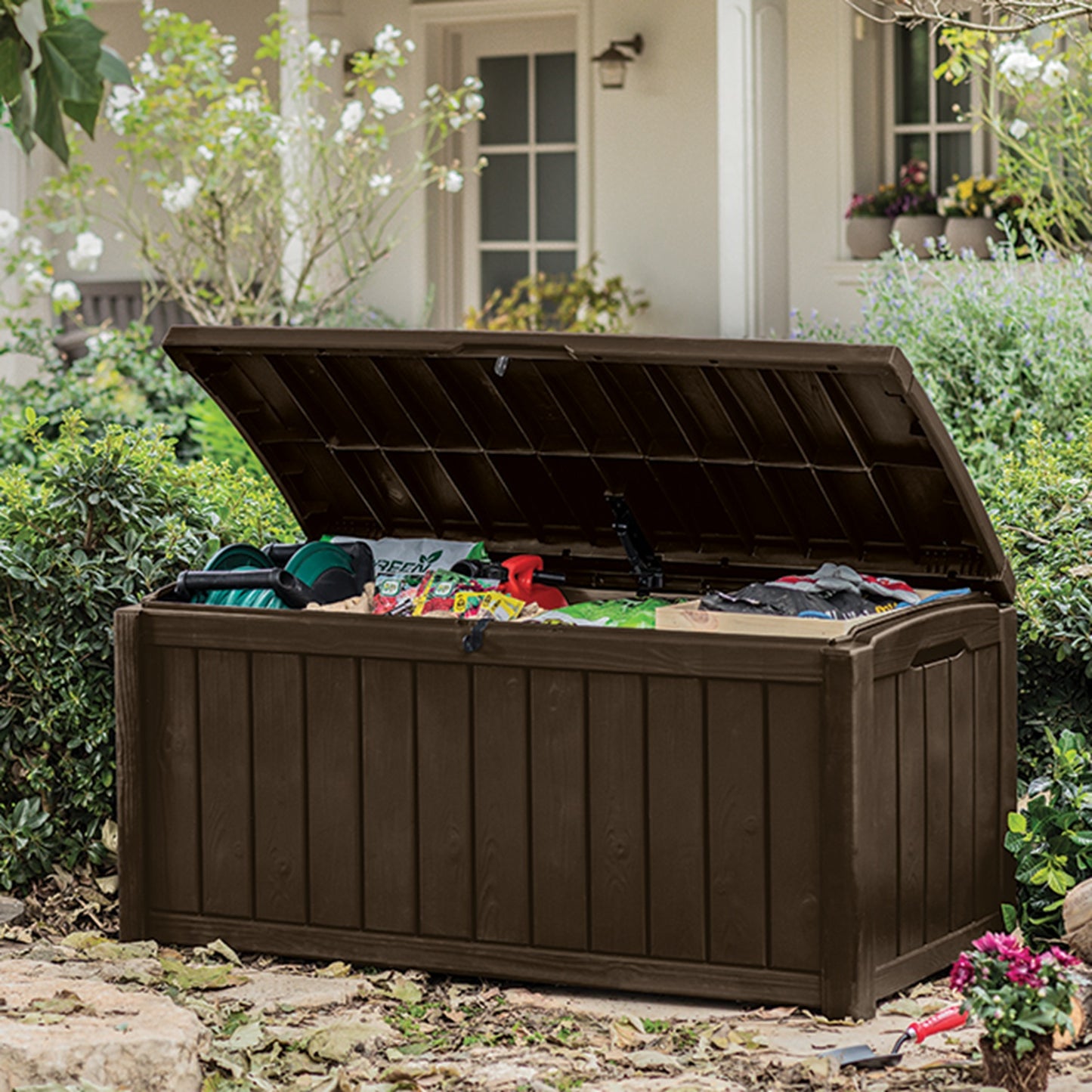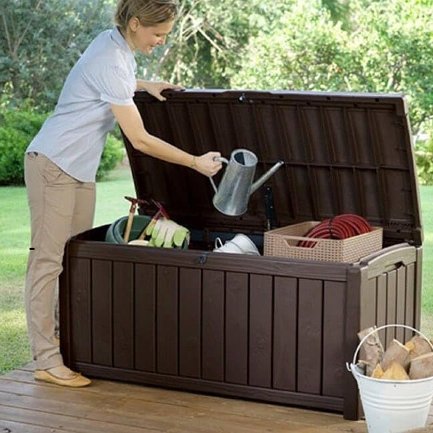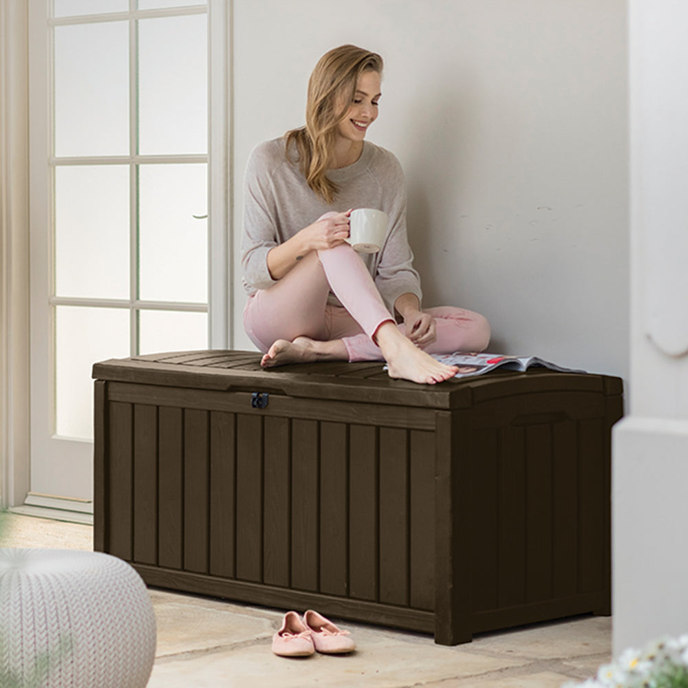 El baúl Glenwood combina capacidad, diseño y durabilidad en una sola pieza. Fabricado en resina plástica de alta calidad con acabado efecto madera, es la solución perfecta para mantener tus espacios ordenados y protegidos del clima.