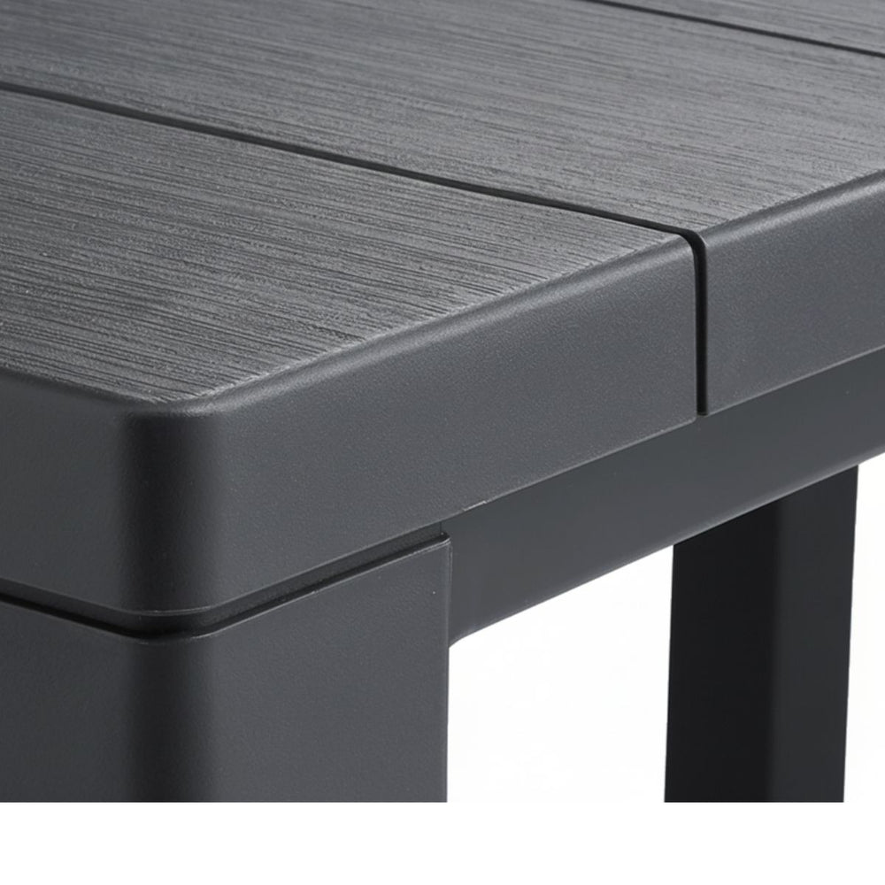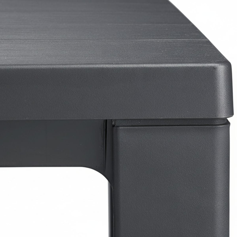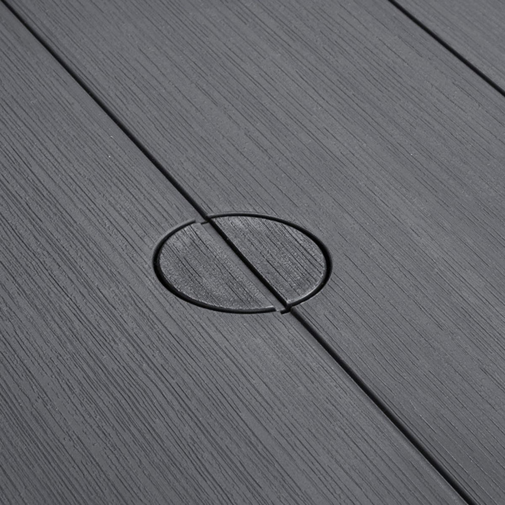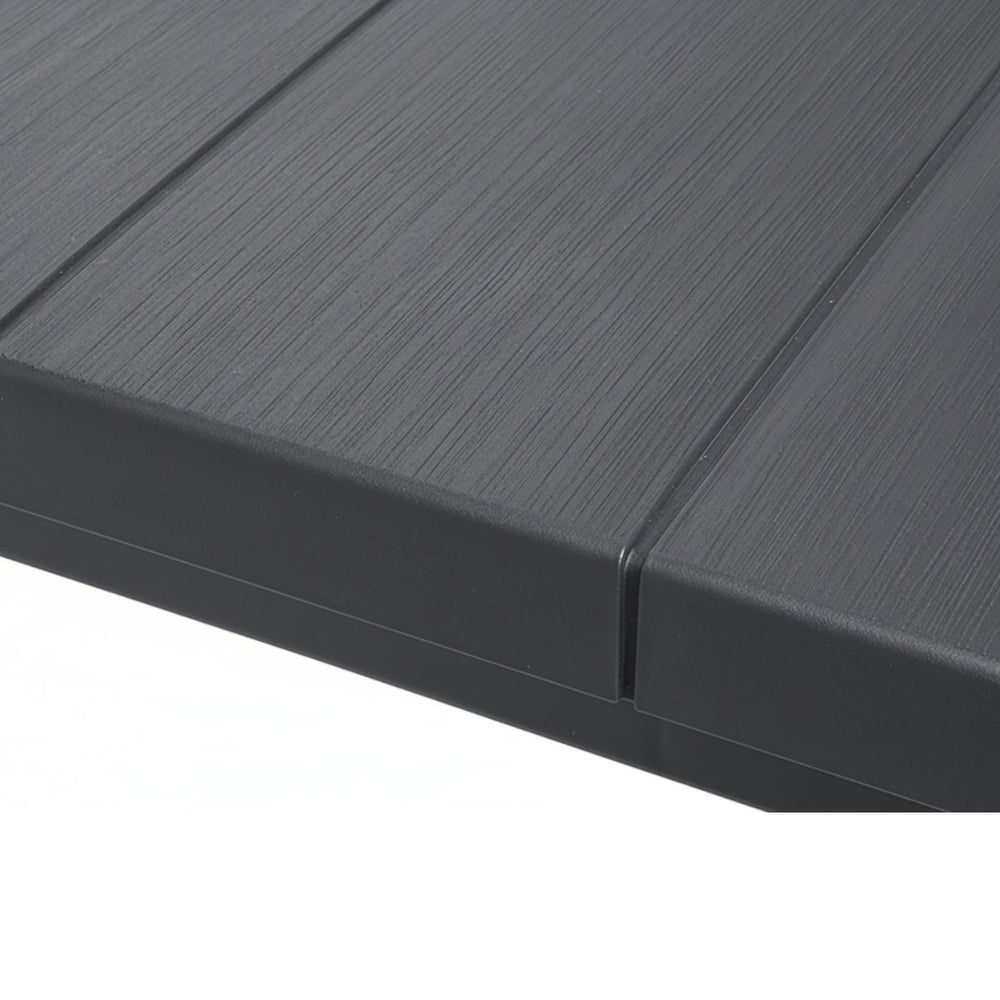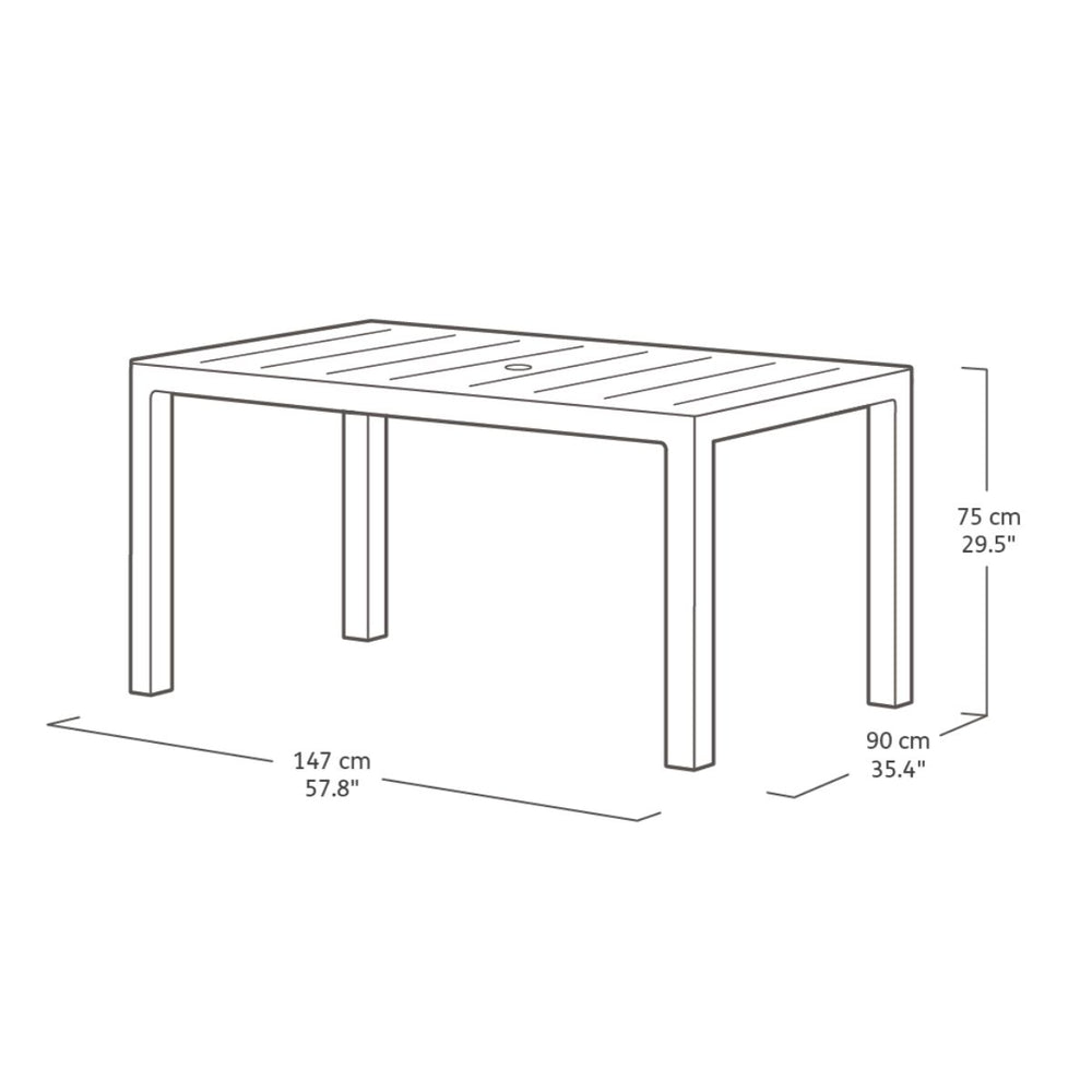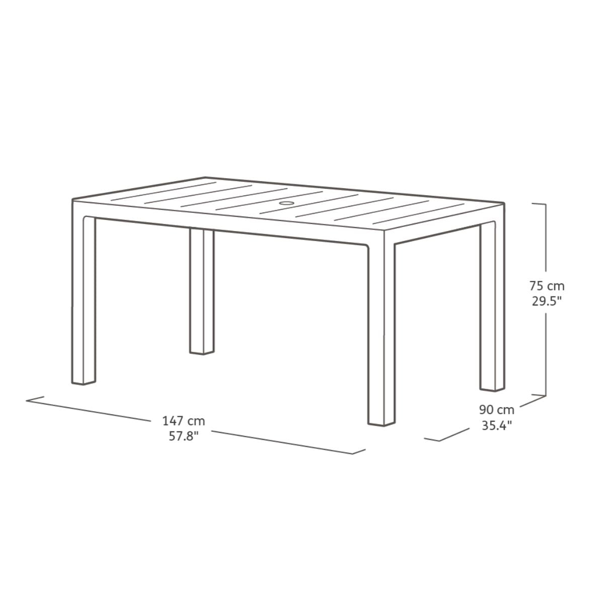 Fabricada en resina duradera de polipropileno, esta mesa ofrece una excelente resistencia a las condiciones climáticas y protección contra los rayos UV. Su textura imitación madera brinda un acabado natural y sofisticado, sin necesidad de mantenimiento especial. Además, incluye un orificio para sombrilla, ideal para disfrutar de sombra en los días soleados.