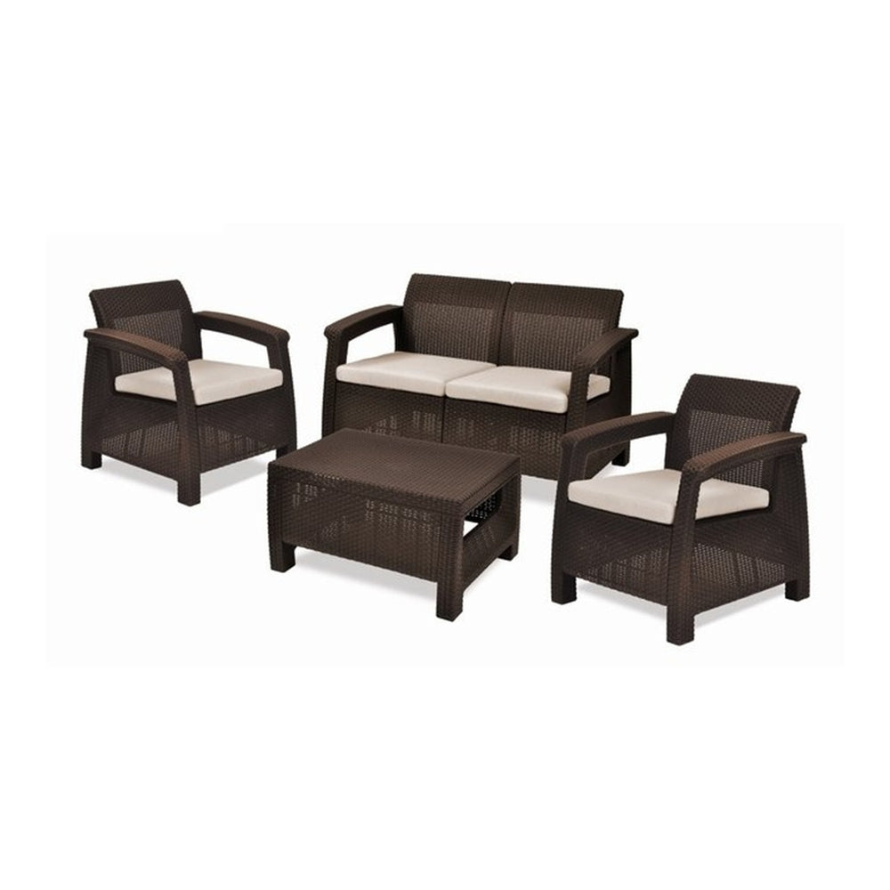 Actualiza tu área de asientos al aire libre con muebles diseñados para verse bien y sentirse aún mejor. El juego de jardin Corfu incluye dos sillones individuales, un sillón de dos cuerpos (todos con sus respectivos almohadones) y una mesa ratona. Con una bella textura simil-ratan y un diseño extremadamente cómodo, el juego está hecho de una resina muy duradera y resistente a la intemperie.
